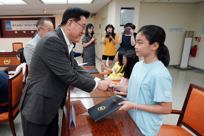 서울 동대문구는 최근 구청 기획상황실에서 제1대 아동·청소년의회 의원으로 위촉된 58명에게 위촉장을 수여하고 아동 상임위원회를 구성했다. 사진은 이날 위촉식에 참석한 유덕열 구청장(왼쪽)이 청소년에게 위촉장을 수여하고 악수를 나누는 모습. (사진제공=동대문구청)