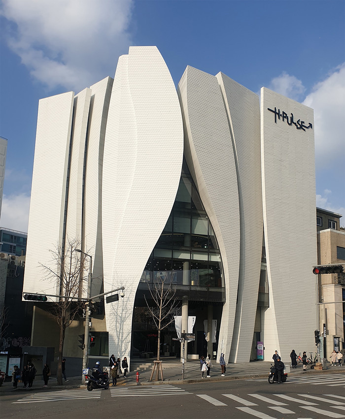 H-PULSE 하나멤버스 라운지가 위치한 H-PULSE는 수직적 곡선의 강렬하고 역동적인 파사드를 구현하여 야간에는 화려한 미디어파사드 영상을 연출하며 하나금융그룹의 핵심가치를 육각형 모듈의 외장 디자인에 담아 그 의미를 더했다.