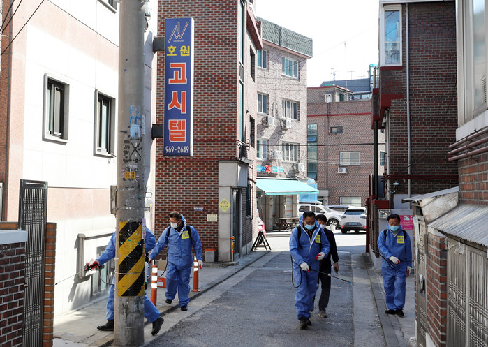 동대문구 주민자치회 방역단이 16일 유학생이 많이 주거하는 휘경동 일대 밀집 주거지역 방역을 하고 있다.