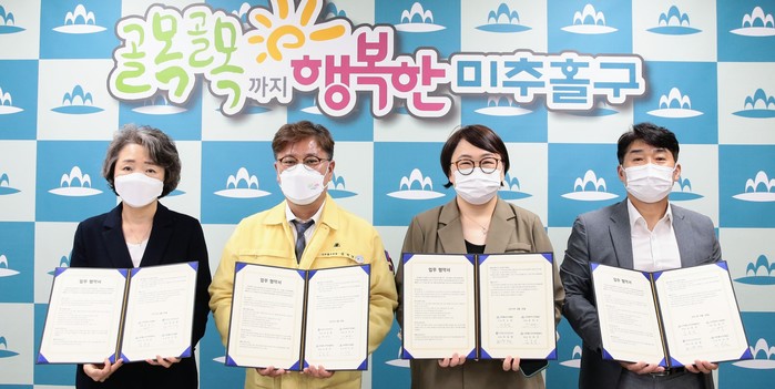 인천 미추홀구가 28일 구청장실에서 인천시고령사회대응센터, 미추홀노인인력개발센터, 미추홀시니어클럽과 업무 협약을 체결했다. 이번 협약을 통해 구와 기관들은 장년 및 시니어를 위한 맞춤형 평생학습지원과 사회공헌 활동, 일자리 마련을 위한 정책 개발과 연구, 추진 등을 협력하기로 했다. 사진은 김정식 구청장(왼쪽 두 번째)과 협약기관 관계자들이 기념촬영을 하는 모습. (사진제공=인천 미추홀구청)