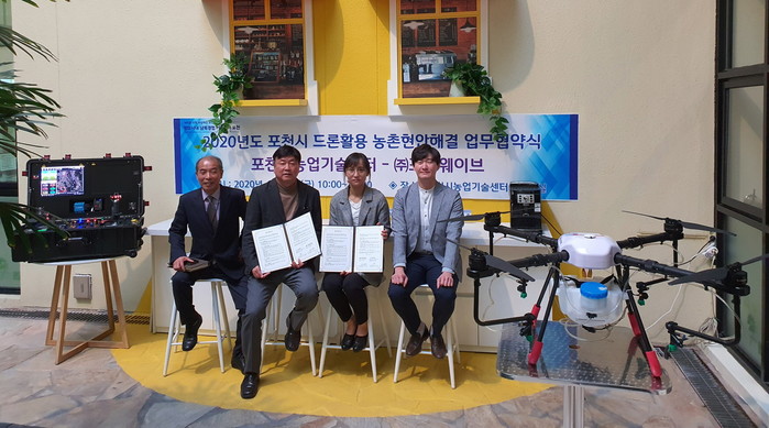 경기 포천시농업기술센터가 드론을 활용한 농업현안문제 해결을 위해 최근 시 소재 (주)포스웨이브와 업무협약을 체결했다. 이에따라 센터는 농·축산분야의 정보 등을 제공하고 포스웨이브는 연구개발 등을 수행하게 된다. 사진은 관계자들이 기념촬영하는 모습. (사진제공=포천시청)