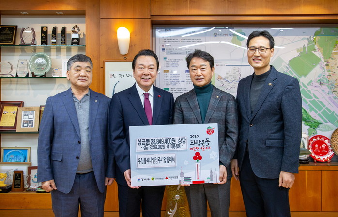서울 강서구는 15일 구청장실에서 우림블루나인입주기업협의회로부터 지역내 어려운 이웃을 위한 성금 3300만원과 600만원 상당의 성품을 기탁받았다. 사진은 노현송 구청장(왼쪽에서 두 번째)과 관계자들이 기념촬영을 하는 모습. (사진제공=강서구청)
