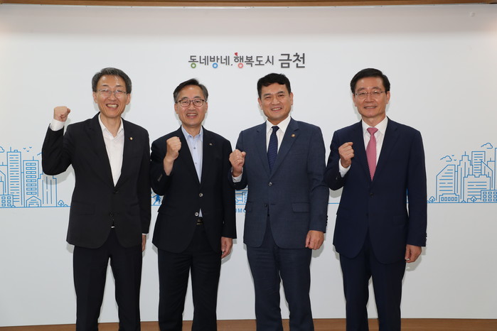 서울 금천구가 최근 구청 12층 대강당에서 신안산선 복선전철 착공을 축하하기 위한 기념식을 개최했다. 사진은 착공기념식에 참석한 이훈 국회의원, 유성훈 구청장, 김경욱 국토교통부 제2차관, 김일평 (주)넥스트레인 대표(왼쪽부터)가 기념촬영을 하는 모습. (사진제공=금천구청)