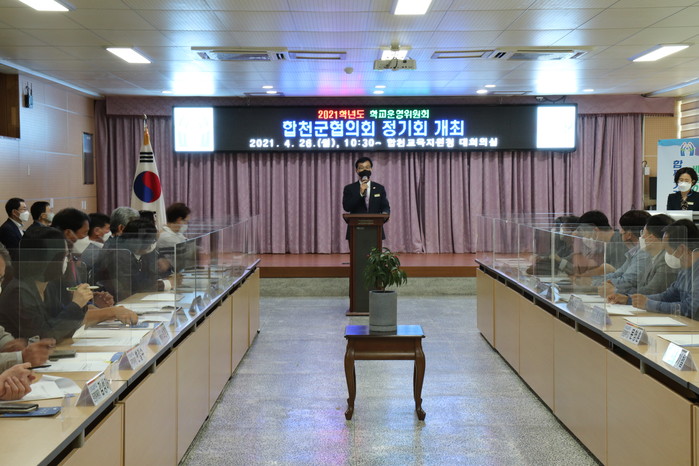 합천교육지원청(교육장 정종화)은 4월 26일(월) 10시 30분, 합천교육지원청 대회의실에서 관내 학교운영위원장이 참석한 가운데 “청렴다짐 및 2021학년도 학교운영위원회 합천군협의회(이하 ’협의회‘) 정기회”를 개최하였다.