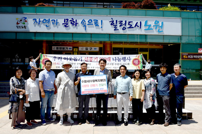 최근 서울 노원구청 정문에서 ‘수암사 사랑의 선풍기 200대 전달식’이 진행됐다. 사진은 오승록 구청장(가운데)과 관계자들이 기념촬영을 하고 있는 모습. (사진제공=노원구청)
