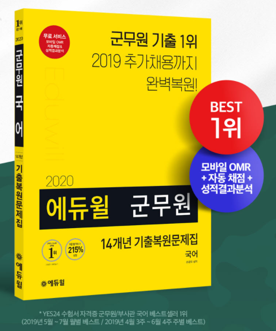 [시민일보 = 여영준 기자] 종합교육기업 에듀윌(대표 박명규)이 발간한 ‘2020 에듀윌 군무원 14개년 기출복원문제집 국어’ 교재가 온라인서점 예스24의 군무원 국어 부문 8월 베스트셀러 1위를 기록했다.