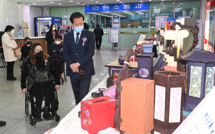 이번 작품 전시회는 지난 3월부터 운영한 한지공예 체험 교실에서 완성한 작품을 선보이는 기획전시회로, 작은 생활 소품부터 장식장까지 척수장애인들이 정성을 들여 제작한 40여 점의 작품이 전시됐다.