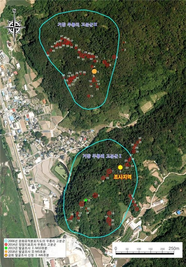 거창 무릉리 고분군은 1997년 지표조사를 시작으로 정밀지표 및 연구조사, 세 차례의 발굴조사와 학술 자문회의 등을 통해 대형분 및 중소형분의 봉토분 86기가 조성되어 있는 거창지역 최대 가야고분군으로 확인되었다.