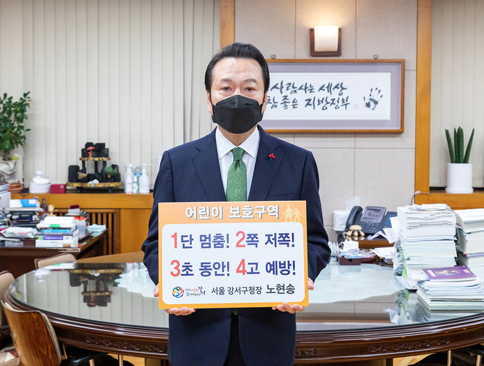 노현송 서울 강서구청장은 27일 어린이보호구역내 안전사고 예방을 위한 ‘어린이 교통안전 챌린지’에 동참했다. 이 캠페인은 어린이 보호 최우선 문화정착과 어린이보호구역내 안전사고 예방을 위한 국민 공감대 형성을 위해 마련됐다. 사진은 노 구청장이 '1단 멈춤! 2쪽 저쪽! 3초 동안! 4고 예방!'이라고 적힌 팻말을 들어보이고 있는 모습. (사진제공=강서구청)
