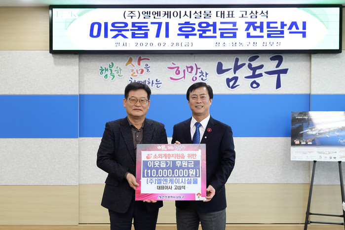 인천 남동구는 최근 (주)엘엔케이시설물로부터 지역내 어려운 환경에서 힘들게 지내고 있는 소외계층을 위해 사용해달라며 이웃돕기 후원금 1000만원을 기탁받았다. 사진은 후원금 전달 후 이강호 구청장(오른쪽)과 고석삼 대표가 기념촬영하는 모습. (사진제공=남동구청)