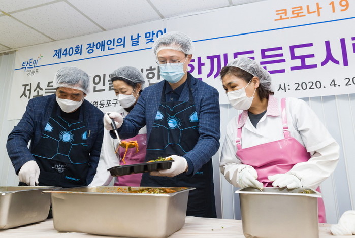 서울 영등포구가 20일 '제40회 장애인의 날'을 맞이해 영등포장애인사랑나눔의집에서 손수 만든 ‘한 끼 든든 도시락’을 직접 만들어 대체식을 지원받는 저소득·홀몸 장애인 130명에 전달했다. 사진은 채현일 구청장(오른쪽에서 두 번째)이 반찬을 담고 있는 모습. (사진제공=영등포구청)