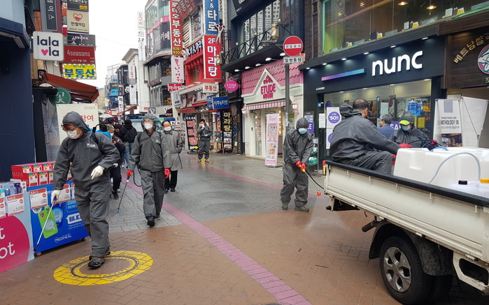 성북구 동선동주민자치회가 삼선새마을금고로부터 기부 받은 100만원으로 방역물품을 구입해 지난 17일 회원, 새마을금고 및 동 직원 등이 참여한 가운데 성신여대 하나로거리 일대 상가, 골목 등을 방역했다. 사진은 관계자들이 소독하는 모습. (사진제공=성북구청)