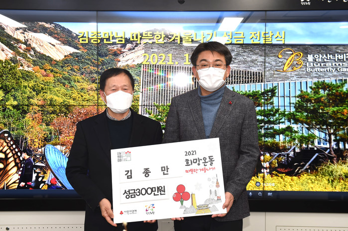 서울 노원구는 최근 김종만 전 서비스공단이사장으로부터 어려운 이웃들을 위한 2021 희망온돌 따뜻한 겨울나기 성금 300만원을 전달받았다. 사진은 전달식에서 오승록 구청장(오른쪽)과 김 전 이사장이 기념촬영을 하는 모습. (사진제공=노원구청)