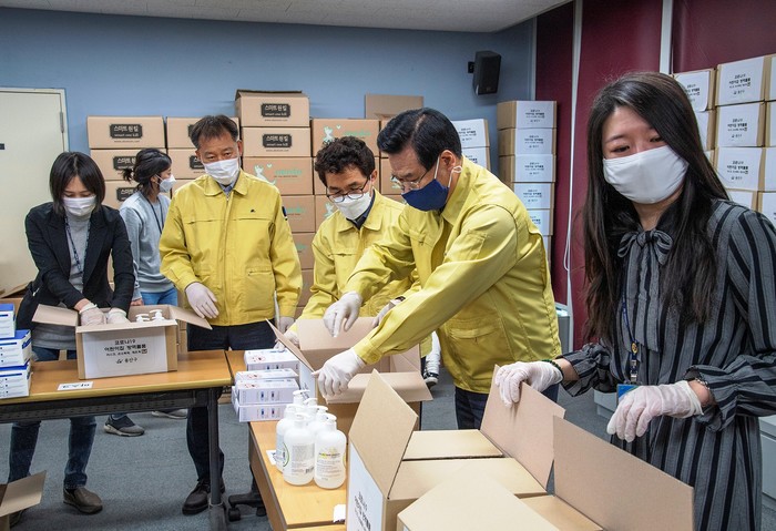 성장현 용산구청장이 7일 구청 주민복지국 회의실에서 공무원들과 함께 코로나19 확산 방지를 위해 지역내 어린이집 118곳에 전달할 덴탈마스크, 손 소독제 등의 방역물품을 포장했다. 사진은 성 구청장과 직원들이 방역물품을 포장하는 모습. (사진제공=용산구청)