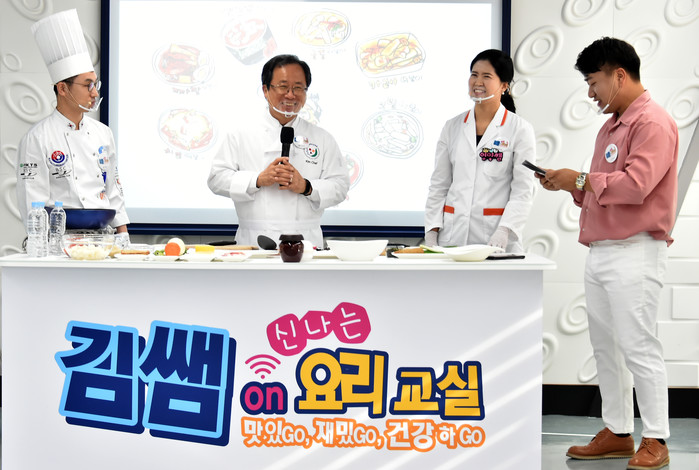 이날 김석준 교육감과 김봉곤 부산롯데호텔 쉐프, 영양교사가 ‘김쌤과 함께하는 떡볶이 원정대’ 요리교실을 진행했다.