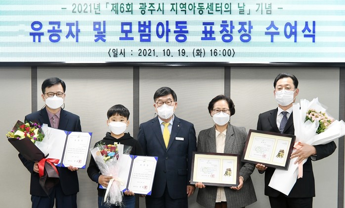 경기 광주시는 지난 19일 제6회 광주시 지역아동센터의 날을 맞아 아동복지 유공자 및 모범 아동 표창장 수여식을 열었다. 이날 시는 소망 지역아동센터장 김정주·기쁘니 지역아동센터장 최현모씨, 도곡초 6학년 박재우·매곡초 6학년 이한빛 학생 등 4명에게 표창장을 수여했다. 사진은 신동헌 시장(가운데)과 수상자들이 기념촬영을 하는 모습. (사진제공=광주시청)