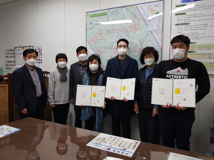 서울 강남구 세곡동이 최근 지역인재 68명(고등학생 35명·대학생 33명)에게 세곡나눔장학회의 후원으로 총 5000만원의 장학금을 전달했다. 사진은 지난 10일 비대면으로 장학금을 전달한 후 장학회 발전을 위해 노력한 회원 3명에게 표창장을 전달하고 있는 모습. (사진제공=강남구청)
