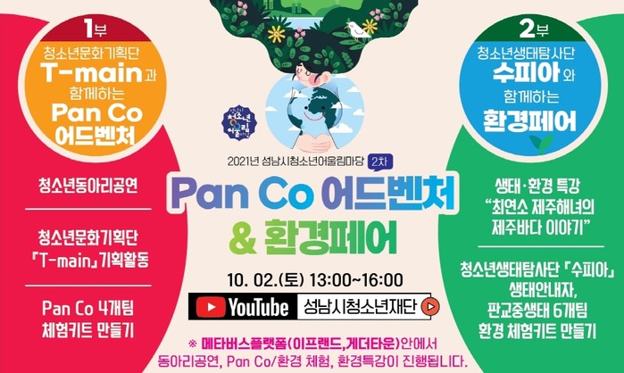 ‘2021년 성남시청소년어울림마당 『Pan Co 어드벤처』’시청은 10월 2일(토) 오후 13시, 성남시청소년재단 유튜브 채널로 접속하면 된다.