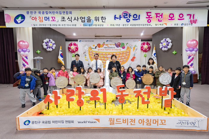 광진구가 최근 구청 대강당에서 지역 국공립어린이집 아동들과 보육교사 300여명이 모인 가운데 ‘2019년 사랑의 동전 모으기’ 행사를 개최했다. 사진은 이날 행사에서 김선갑 구청장(왼쪽 두 번째) 및 참여자들이 기념촬영을 하는 모습. (사진제공=광진구청)