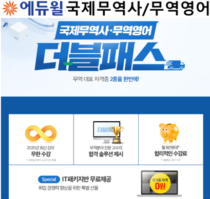 [시민일보 = 황혜빈 기자] 종합교육기업 에듀윌이 국제무역사, 무역영어 등 무역 대표 자격증 2종을 동시에 대비할 수 있는 ‘더블패스’ 강의를 선보인다고 밝혔다.