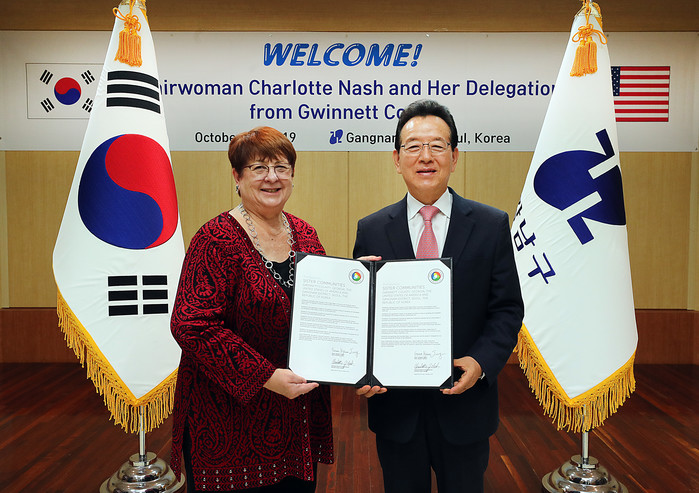 29일 서울 강남구가 구청 큰회의실에서 ‘강남구-美 조지아주 귀넷카운티 자매결연 10주년 기념 美 귀넷카운티 경제대표단 간담회’를 열고 양 기관간 경제 및 교류협력사업을 논의했다. 사진은 정순균 구청장이 샤롯 내시(Charlotte Nash) 귀넷카운티 의장과 자매결연 성명서에 서명 후 함께 기념사진을 촬영하고 있는 모습. (사진제공=강남구청)
