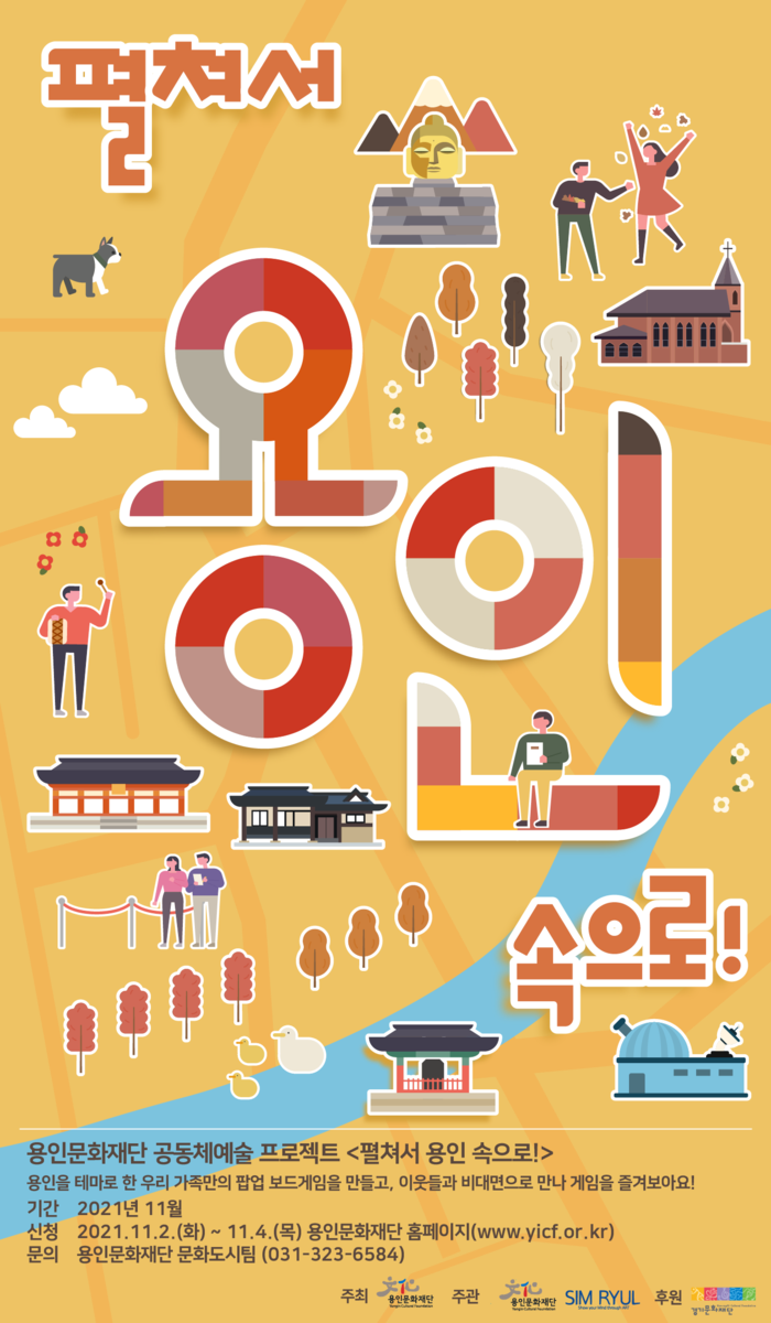 문화예술을 통해 용인 시민과 지역사회를 연결하고 일상에 활력을 불어넣기 위해 기획된 이번 프로젝트는 용인문화재단의 예술교육 프로그램인 ‘2021 당신의 앞마당까지 달려갑니다’ 의 일환으로 운영되고 있으며, 용인문화재단과 지역 문화예술매개자 아트러너(Art Runner), 문화예술교육기업 ㈜심률이 공동으로 기획하여 용인의 역사·명소·예술·인물 등 지역에 관한 다양한 콘텐츠를 게임으로 녹여낸 ▲팝업(pop-up) 보드게임 키트와 ▲이웃과 함께하는 ‘비대면(ZOOM) 보드게임’ 프로그램으로 구성되어 있다.