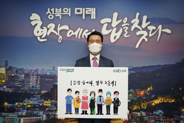 이승로 서울 성북구청장이 지난 16일 코로나19 감염의 위험을 무릅쓰고 대면노동에 종사하는 보건의료 등 종사자들을 격려하고 응원하기 위한 ‘고맙습니다. 필수노동자’ 캠페인에 동참했다. 사진은 이 구청장이 필수노동자들에게 응원과 감사인사를 전하는 피켓을 들고 캠페인에 참여하고 있는 모습. (사진제공=성북구청)