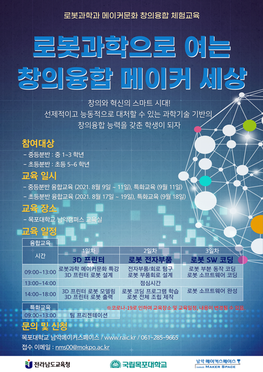 | ▲ (웹용)'로봇과학으로 여는 창의융합 메이커 세상' 포스터(출처=국립목포대) |