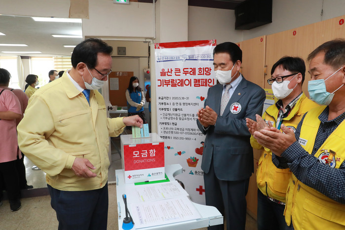 21일 울산시 중구 우정동 행정복지센터에서 송철호 울산시장(왼쪽)이 긴급재난지원금 선불카드를 수령한 뒤 이를 기부하는 울산 큰 두레 희망 기부 릴레이에 동참하고 있다.