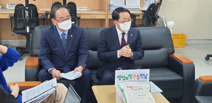 | ▲ 김 경호 전남도 농축산식품국장(우측)과 박홍재 농업기술원장이(좌측) 3일 기자실에서 쌀 증대방안에 대해 설명하고 있다. |