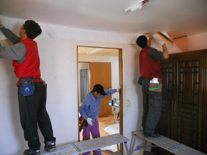 경기 화성시가 최근 조손가정 등의 아동들을 위한 ‘수호천사 집수리’ 사업에 나서 송산면 등 8개 지역 10가구를 대상으로 주거환경을 개선했다. 각 가구에는 LED등 교체 등 100만원 내외의 재료비로 개·보수 공사가 지원됐으며, 청소와 소독 서비스까지 제공됐다. 사진은 봉사자들이 도배를 하고 있는 모습. (사진제공=화성시청)
