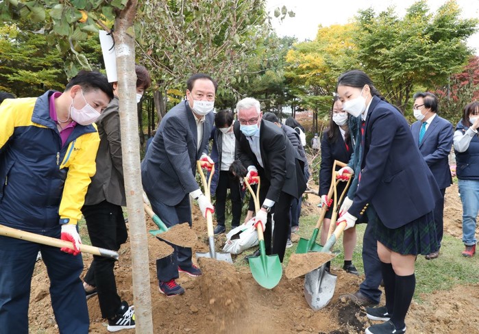 유동균 마포구청장이 최근 상암동 구룡근린공원에서 마포구 500만그루 나무심기 기념식수 사업의 일환으로 열린 '미래를 여는 숲 조성' 행사에 참석했다. 사진은 행사에서 유 구청장(왼쪽에서 세 번째)이 참석자들과 함께 기념식수를 하고 있는 모습. (사진제공=마포구청)