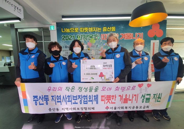 서울 은평구 증산동 지역사회보장협의체는 지난 14일 지역복지 향상을 위해 '2021 희망온돌 따뜻한 겨울나기 성금 전달식'을 진행했다. 이번 성금 전달식에서 협의체 위원들이 기부한 230만원은 사회복지공동모금회를 통해 23가구에 후원할 예정이다. 사진은 전달식에서 관계자들이 기념촬영을 하는 모습. (사진제공=은평구청)