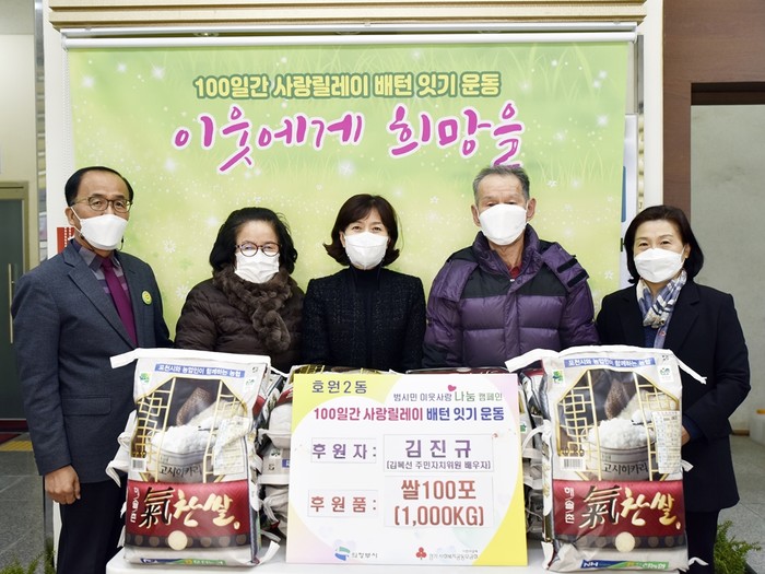 경기 의정부시 호원2동 행정복지센터 주민자치위원회 복지 분과장 김복선 위원 부부 내외가 지역내 저소득 홀몸노인 등 어려운 이웃을 위해 쌀 100포(1000kg)를 기탁했다. 사진은 전달식에서 김 위원 부부와 관계자들이 기념촬영을 하는 모습. (사진제공=의정시청)
