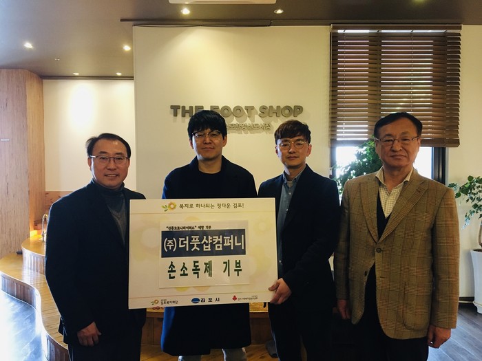 경기 김포시는 25일 (주)더풋샵 김포운양점, 김포한강신도시점으로부터 손소독제 600개(약 1000만원 상당)를 전달받았다. 기탁된 손소독제는 지역내 사회복지시설에 배분될 예정이다. 사진은 더풋샵 관계자들이 기념촬영을 하는 모습. (사진제공=김포시청)