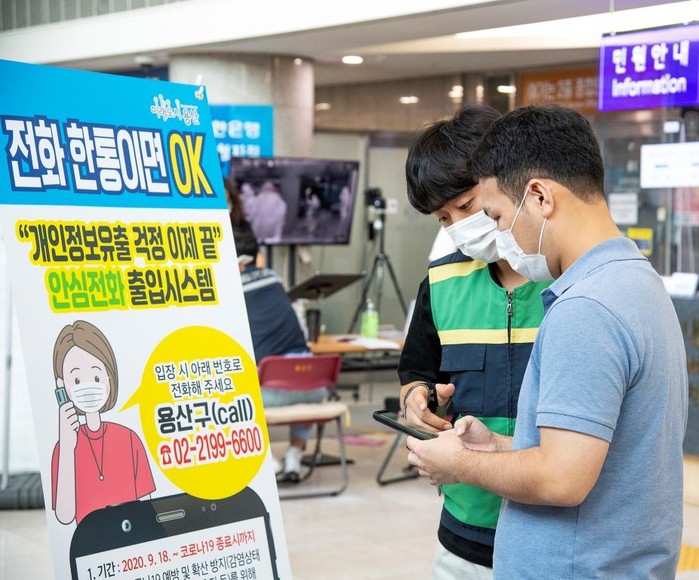 서울 용산구가 21일부터 서울시 자치구 최초로 휴대전화를 활용한 ‘발신자 전화번호 출입자 관리 시스템’을 도입했다. 사진은 구청 이용자가 발신자 전화번호 출입관리 시스템을 이용해 구청을 출입하고 있는 모습. (사진제공=용산구청)