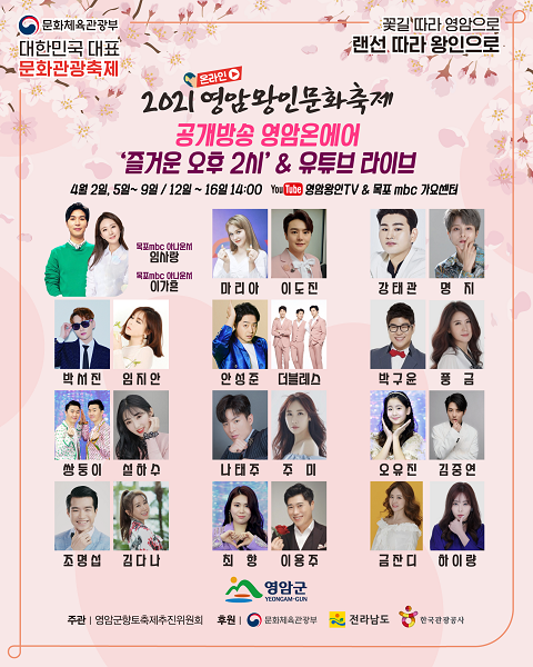 한편, 2021 온라인 영암왕인문화축제는 유튜버 창현의 거리노래방을 오는 3일 토요일 오후 2시부터 5시까지 ‘영암왕인TV’를 통해 실시간 라이브 방송할 예정이며, 유튜버 한나의 영암 아틀리에 10선을 오늘(1일)부터 오는 11일까지 오후 1시부터 30분간 ‘영암왕인TV’를 통해 공개한다. 그리고 유튜버 정호영 셰프의 ‘기찬영암 푸드쇼’를 오는 4일 일요일 오후 2시부터 3시까지 라이브로 진행한다.
