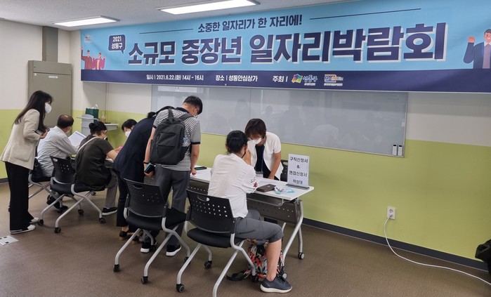 서울 성동구는 지난 22일 소규모 중장년 일자리박람회를 개최했다. (사)한국경영혁신중소기업협회 중장년일자리희망센터와 합동으로 개최한 이날 행사에는 총 10개 기업이 참가해 판매·청소 등 구인 규모가 110여명에 달했다. 사진은 소규모 중장년 일자리 박람회가 진행되고 있는 모습. (사진제공=성동구청)
