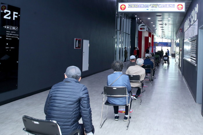 [고양=이기홍 기자] 28일 개소한 ‘고양시 코로나19 안심 예방접종(일산서구)’에서 2분기 접종 대상자인 75세 이상 어르신들이 대기하고 있다.