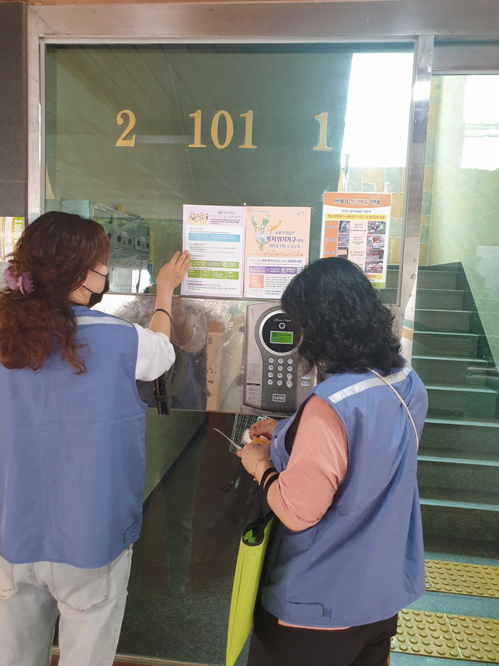 경기 안산시 상록구 부곡동 지역사회보장협의체가 복지사각지대 발굴을 위해 9~31일 홍보활동을 진행한다. 비대면 활동을 원칙으로 2인1조로 활동하며 집집마다 홍보 리플릿을 부착하고, 주변의 이웃을 집중 발굴하고 있다. 사진은 협의체위원들이 아파트 출입구에 홍보 리플릿을 부착하고 있는 모습. (사진제공=안산시청)