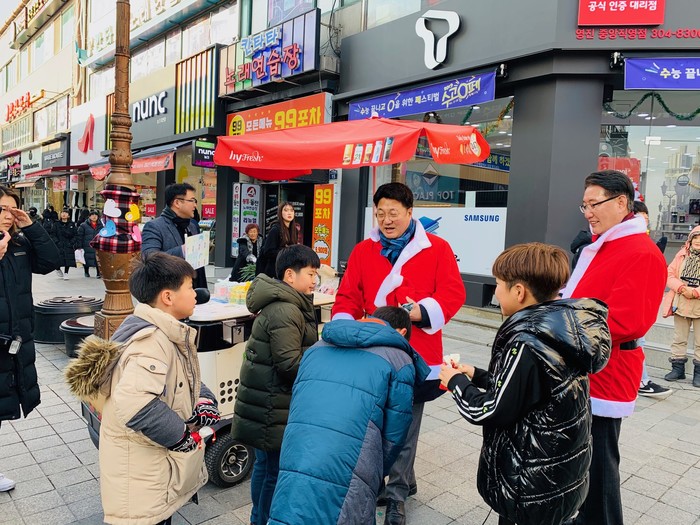 경기 이천시 창전동이 최근 엄태준 시장, 지역 사회단체 및 기업체 등 197곳이 참여한 가운데 지역내 저소득가정 자녀들에게 소원선물을 접수해 전달하는 '산타할아버지 오셨네' 행사를 진행했다. 사진은 엄 시장이 아이들과 인사를 나누는 모습. (사진제공=이천시청)