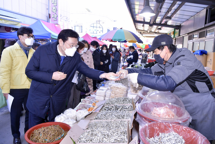 이용섭 시장은 첫 행선지로 코로나19로 이용객 감소 등 피해를 겪고 있는 광산구 송정매일시장과 송정5일시장을 찾아 설맞이 전통시장 장보기를 전개하고 상인들의 애로사항을 청취했다.