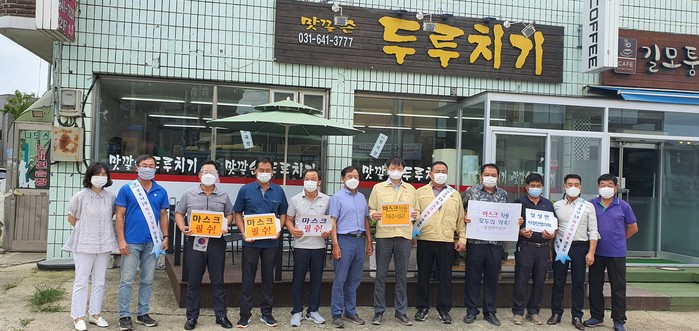 경기 이천시 설성면 이장단협의회는 최근 수도권에 코로나19 확진자가 증가하는 가운데 1일 생활방역의 가장 기본이 되는 '마스크 착용 준수 캠페인'을 펼쳤다. 사진은 이날 캠페인에 참여한 봉사자들이 기념촬영을 하는 모습. (사진제공=이천시청)