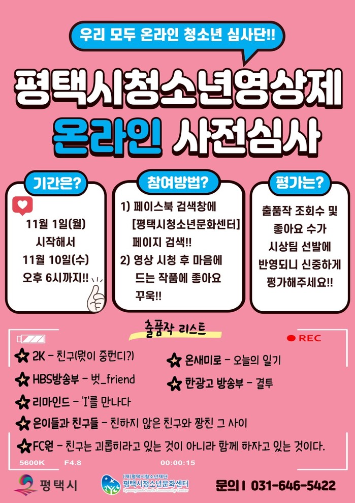[평택=오왕석 기자] 평택시(시장 정장선) 위탁기관인 (재)평택시청소년재단 평택시청소년문화센터(센터장 이종규)는 ‘평택시청소년영상제’ 출품작 온라인 사전심사를 지난 1일부터 오는 10일까지 진행한다고 밝혔다.
