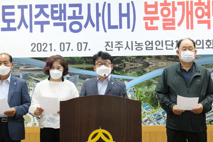 진주시 농업인단체협의회(회장 임호식)는 7일 오전 11시 진주시청 브리핑룸에서 ‘근본적인 제도 보완이 아닌 LH 해체 개혁안 절대 반대’를 주장하는 성명을 발표했다.