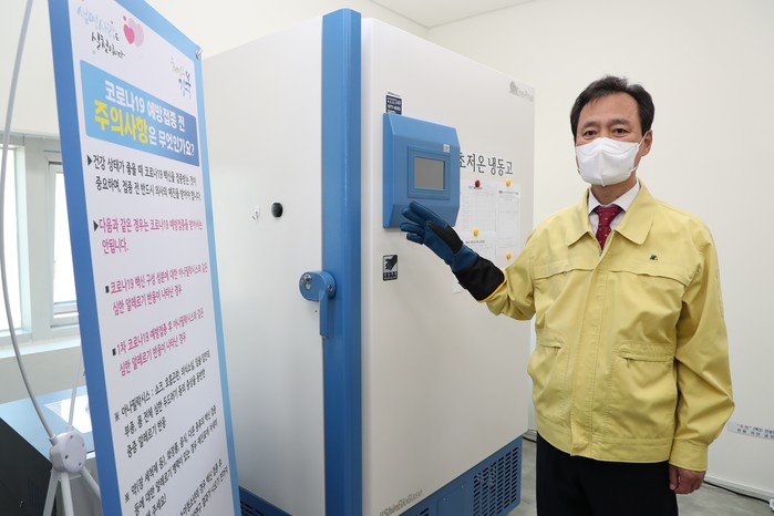 서울 강북구가 8일 강북문화예술회관에 마련한 백신예방 접종센터에서 코로나19 백신접종 모의훈련을 실시해 상황별 시나리오에 따라 최대한 실제 상황과 유사하게 진행했다. 사진은 박겸수 구청장이 코로나 백신 초저온 냉장고를 살펴보고 있는 모습. (사진제공=강북구청)