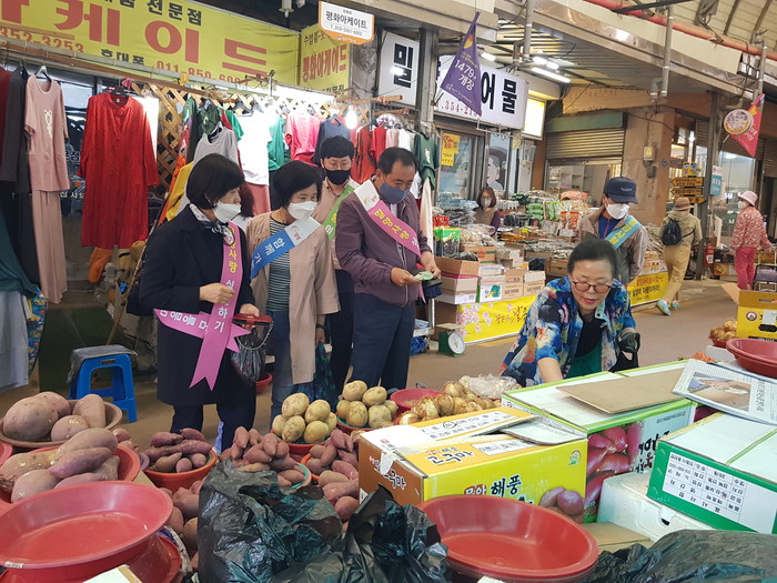 이날 행사는 코로나19 장기화로 인해 경제적 어려움을 겪고 있는 상인들을 돕고 침체된 지역경제 활성화를 위해 마련됐으며, 회원들은 밀양사랑상품권으로 생필품, 찬거리 등을 구매하고 시장 내 식당을 이용하는 등 골목상권 살리기에 앞장섰다.