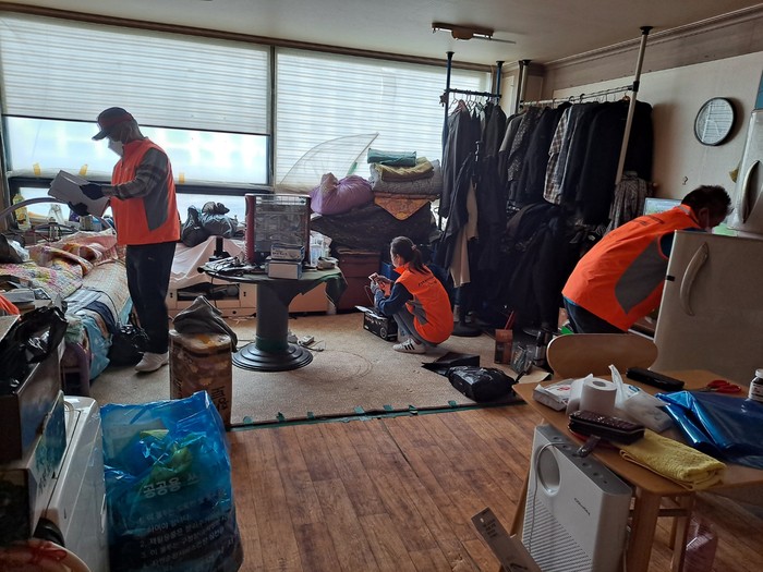 인천 서구 검단동 희망우산 지역사회보장협의체는 최근 지역내 복합적인 복지 욕구를 가진 동 사례관리 대상자 중 거주환경의 정리정돈이 시급하게 필요한 3가구를 대상으로 환경 정비를 진행했다. 사진은 이날 봉사자들이 대상 가구에서 쓰레기 및 물품을 정리하고 있는 모습. (사진제공=서구청)