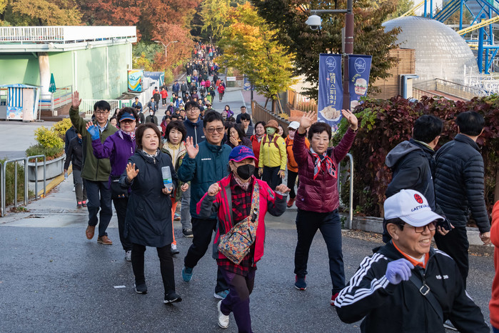 서울 광진구가 오색단풍으로 아름답게 물든 가을날인 29일 어린이대공원에서 ‘2019 광진구민 한가족 건강걷기대회’를 개최했다. 사진은 대회에 참여한 주민들이 걸으며 포즈를 취하고 있는 모습. (사진제공=광진구청)