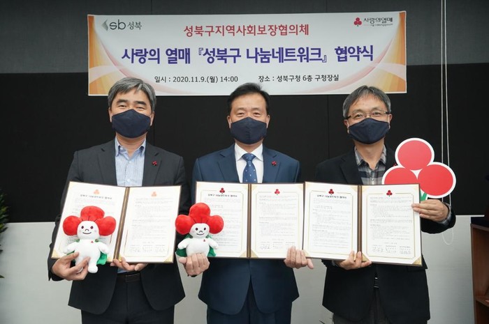 서울 성북구가 지난 9일 구청에서 소외된 이웃을 위한 지역 복지자원 관리와 배분의 신속성 효율성 높이기 위해 서울사회복지공동모금회 및 구 지역사회보장협의체와 '성북구 나눔네트워크' 협약을 체결했다. 사진은 이승로 구청장(가운데)과 양기관 관계자들이 협약서를 들고 기념촬영을 하는 모습. (사진제공=성북구청)